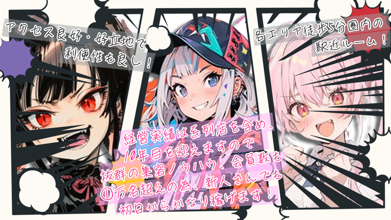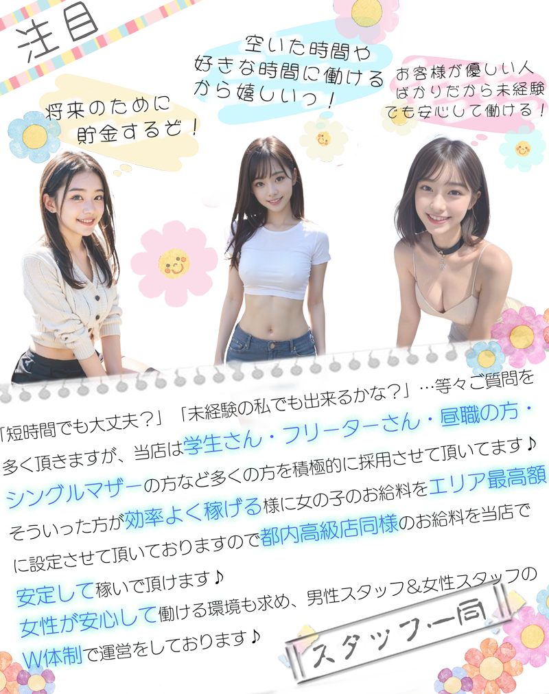 | 待遇 | 週3日以上出勤可能大歓迎! 完全歩合制/全額日払制/制服貸与 ■店泊施設も充実(住み込み可) ■掛け持ちOK! ■完全個室待機 ■お友達紹介ボーナスあり ■保証制度があるので安心して働く事が出来ます。 指名料100%支給(写真指名でも) |