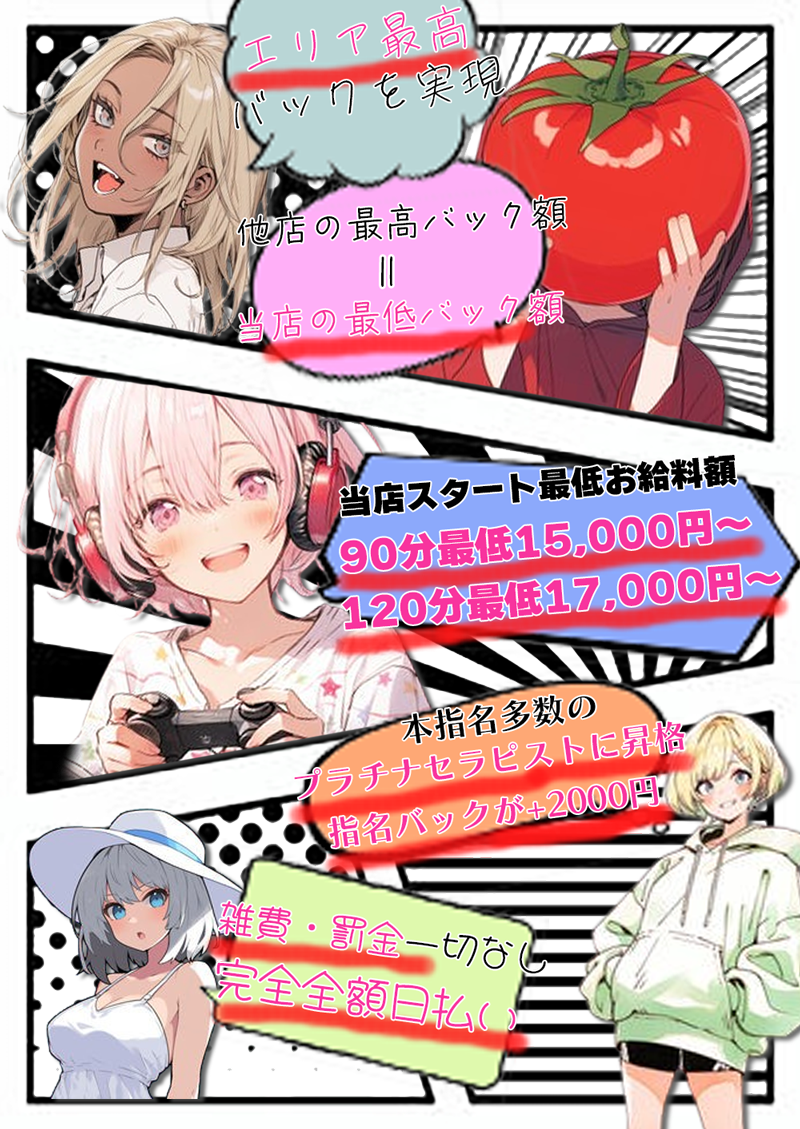 | お給料 | ◆お給料歩合制 50%~各種待遇あります。 ◆安心の時給保証制度もございます。出勤したけどお給料が0円なんていうことはございませんので安心♪ ◆全額日払いです!【雑費・罰金等一切なし】なので本当に高収入です。急な出費にも対応! ◆高収入お給料シュミレーション (週3日 1日8時間勤務の場合) 平日 17時から24時(7時間) 90分コース指名×1本(¥11,000)+120分コース指名×2本(¥26,000)=日給37,000円 休日 12時から23時(11時間) 90分コース指名×2本(¥22,000)+120分コースフリー×1本(¥12,000)+150分コース指名×1本(¥15,000) =日給49,000円 ◆平日を週2日+休日を週1日=週3日出勤で合計¥123,000 ◆1ヶ月の給料合計492,000円になります! 高収入お給料システムについて詳しくはお問い合わせ下さい。 |